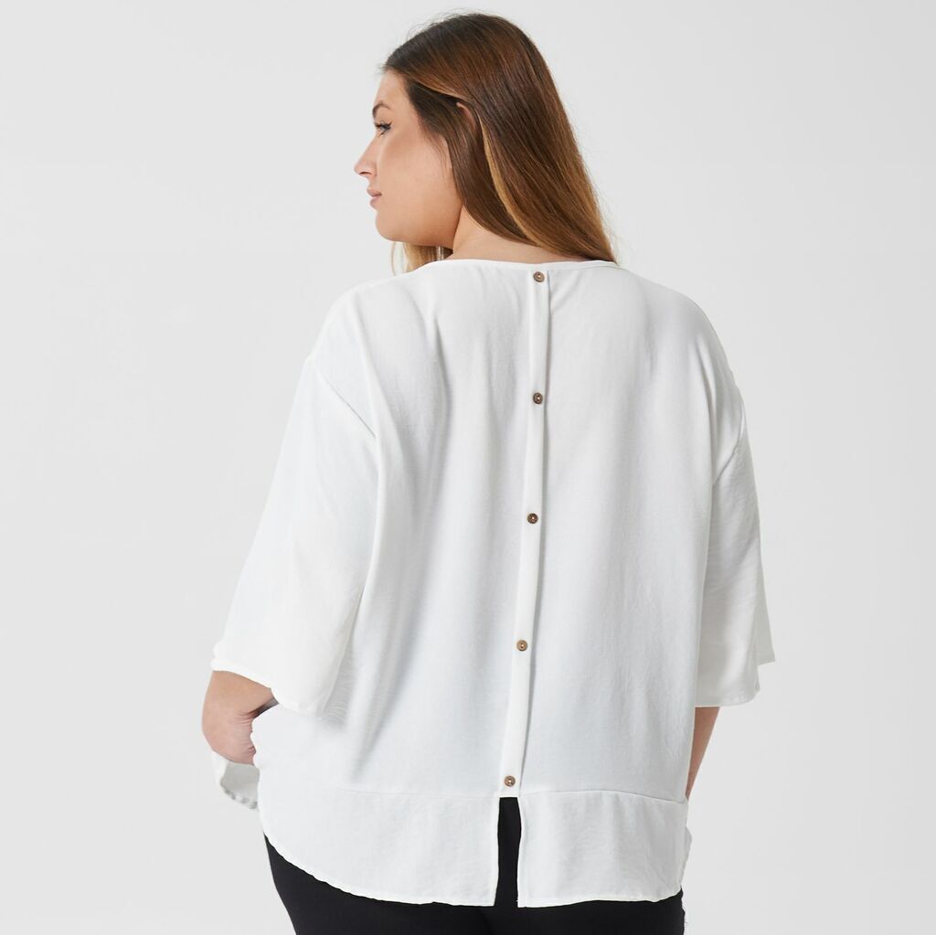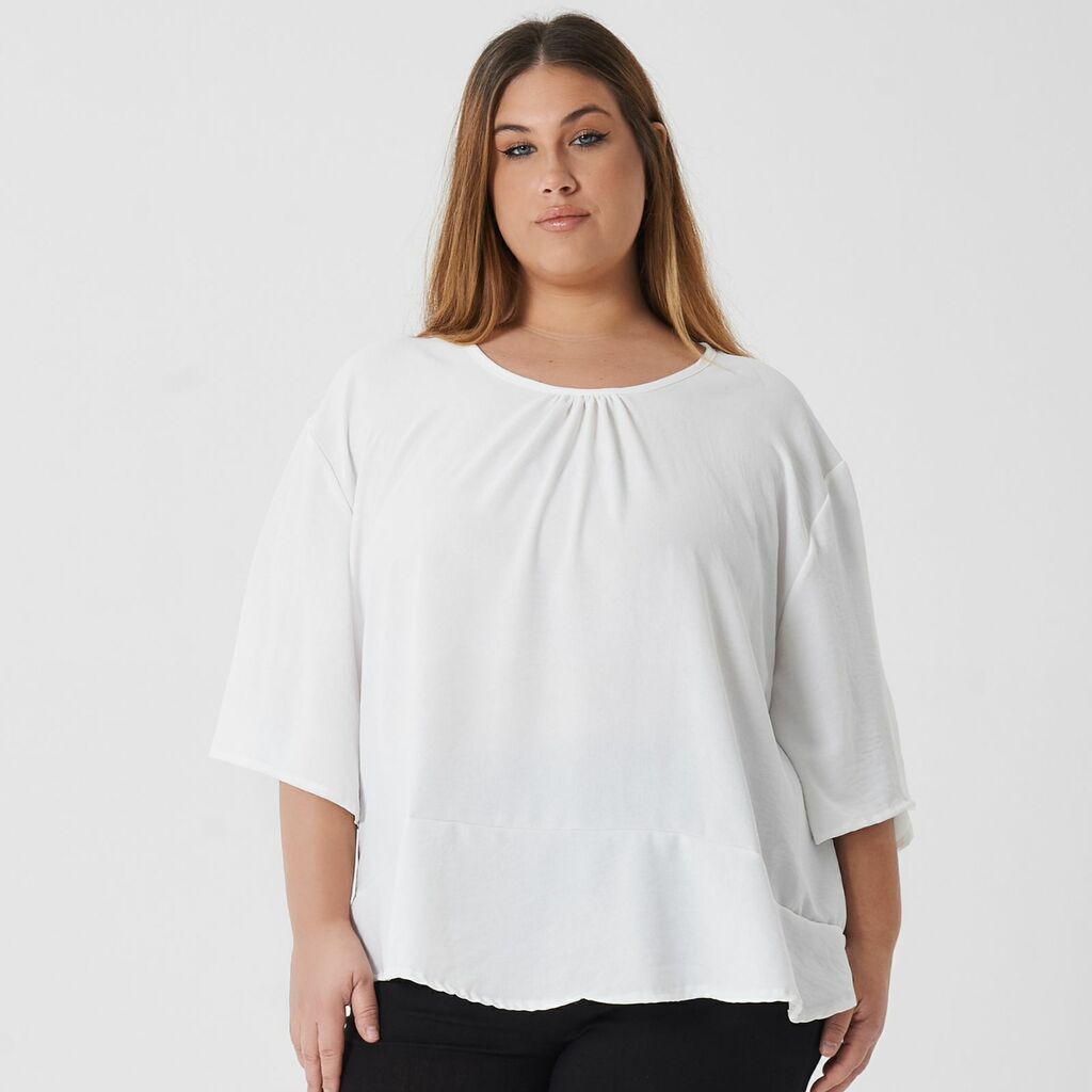 Blusa con frunce en el centro del pecho, volado leve en cadera y manda 3/4